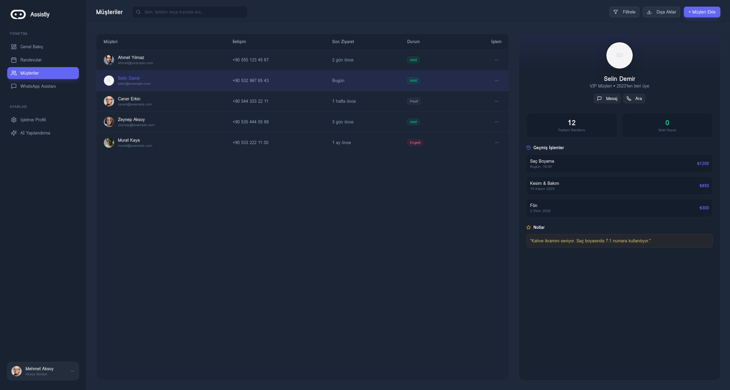 “Eskiden saç keserken sürekli telefon çalardı, randevu yazmak için işimi bırakırdım. Şimdi Assistly her şeyi WhatsApp'tan hallediyor, ben sadece işime odaklanıyorum. Harika bir sistem!”